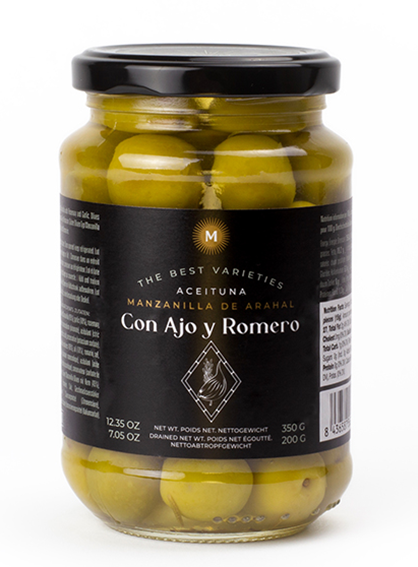 Grüne spanische Manzanilla-Oliven mit Kern, eingelegt mit würzigen Knoblauch und Rosmarin.
